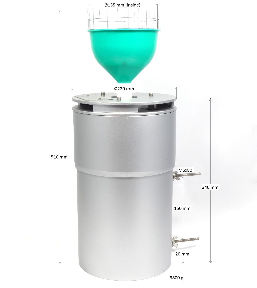 Este muestreador de lluvia fue especialmente diseñado para recolectar y tomar muestras mensuales compuestas según lo solicitado para redes de precipitación de isótopos estables, pero puede usarse para cualquier propósito de muestreo de lluvia y nieve si desea evitar la reevaporación y el uso de aceite de parafina medicinal, como La presencia de fracciones de aceite en la muestra de agua puede crear varios problemas para el análisis de laboratorio.